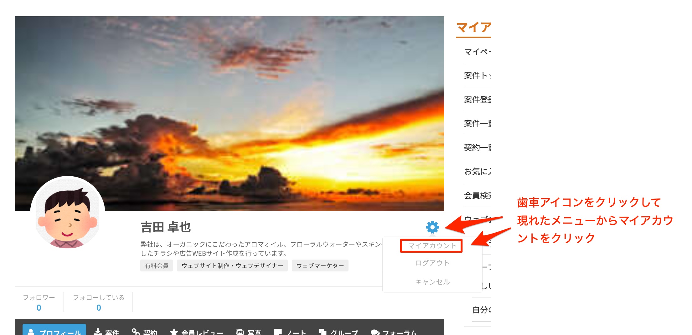 プロファイルヘッダーの歯車アイコンをクリックすると表示されるメニューから「マイアカウント」を選択すると、アカウントが編集できます。