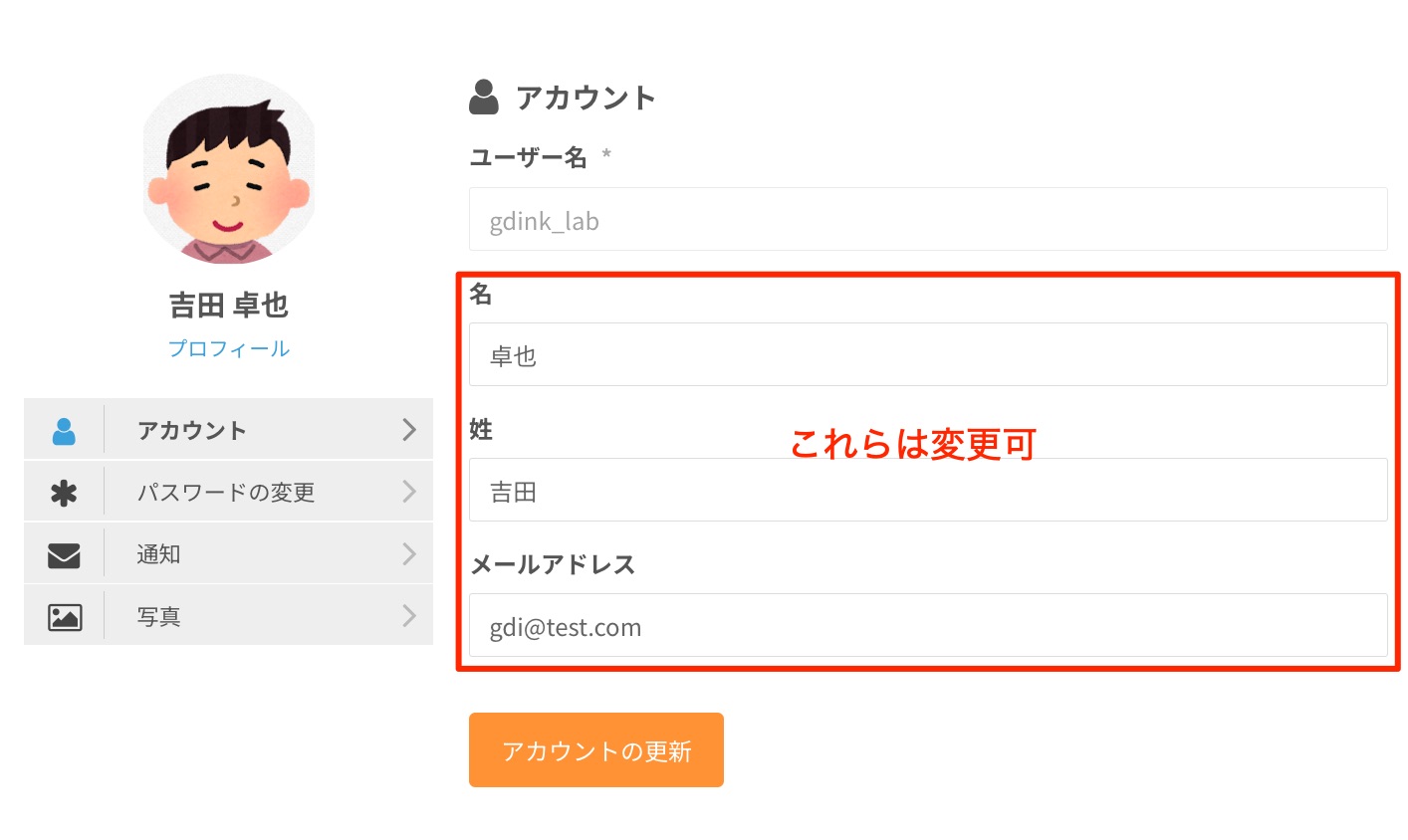アカウント情報を編集できます。変更できるのは姓名及びメールアドレスです。ユーザー名は変更できません。