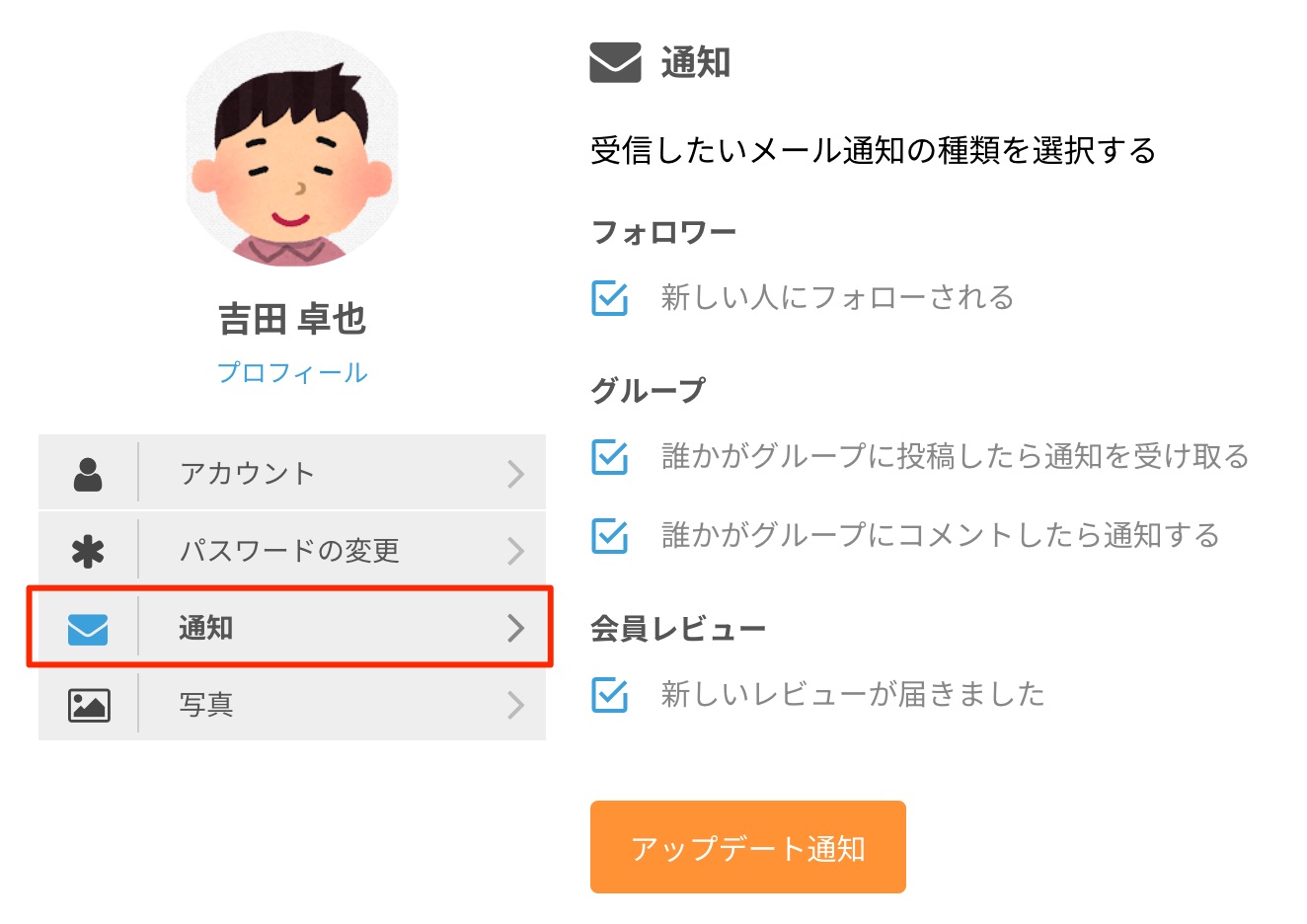 メールで受信したい通知を設定してください。ここで設定できるのは、会員交流に関連する通知だけです。案件に関する通知は案件トップページで設定します。